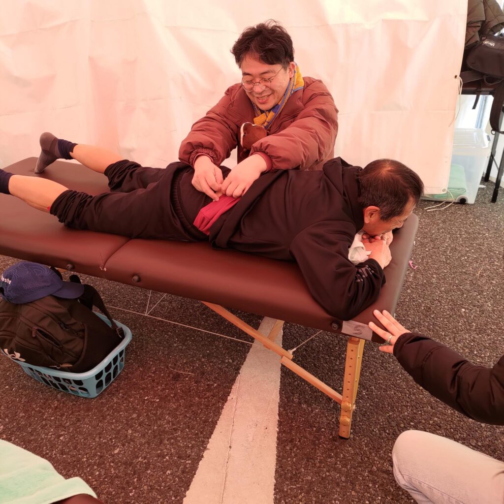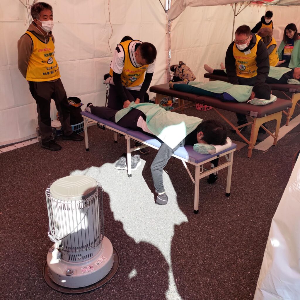 スタート前のランナーへは、軽く体をほぐしパフォーマンスを高める目的で施術を行いました。